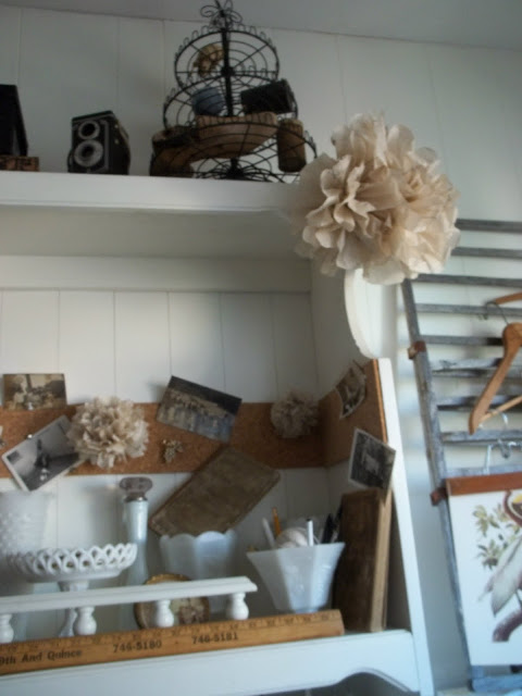 I'm using my milk glass collection to hold some supplies.