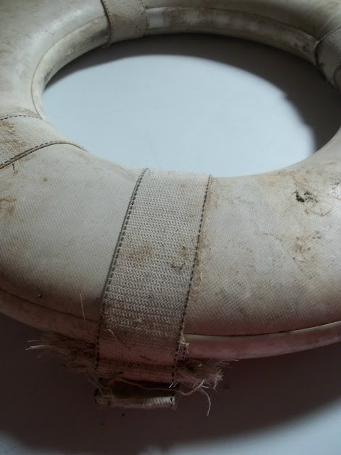 My Hubby found this life preserver out by the curb. I thought I'd spuce it up to use for some future craft project. I cut off the old canvas straps, scrubbed it really well and spray painted it white.